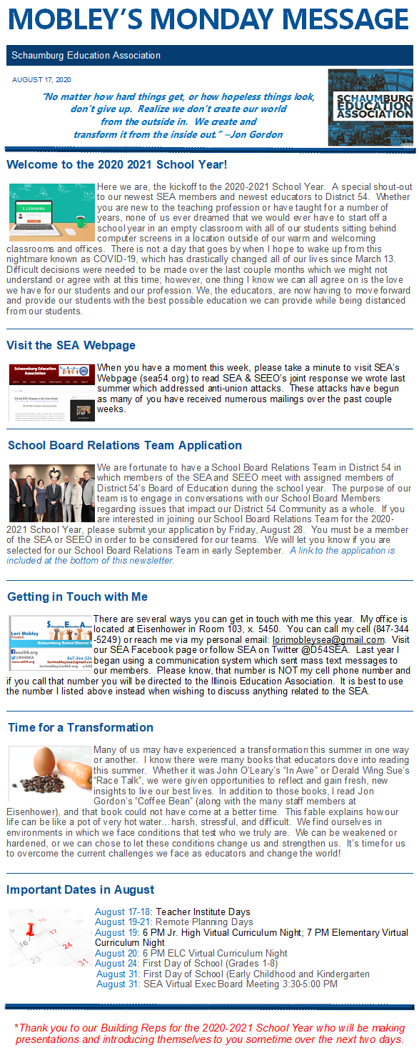 Mobley’s Monday Message 8-17-2020 Here are the links mentioned in this week’s newsletter: School Board Relations Team Application SEA’s Website Related