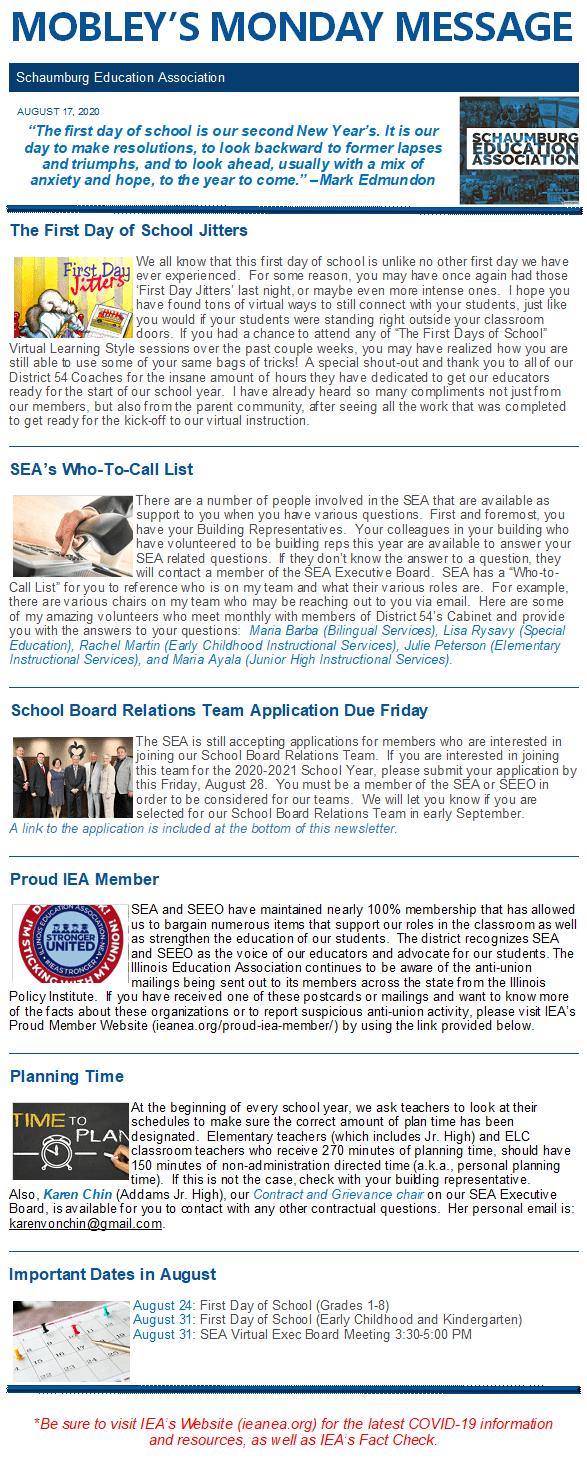 Mobley’s Monday Message 8-24-2020 Here are the links mentioned in this week’s newsletter: School Board Relations Team Application IEA’s Proud Member Website Related