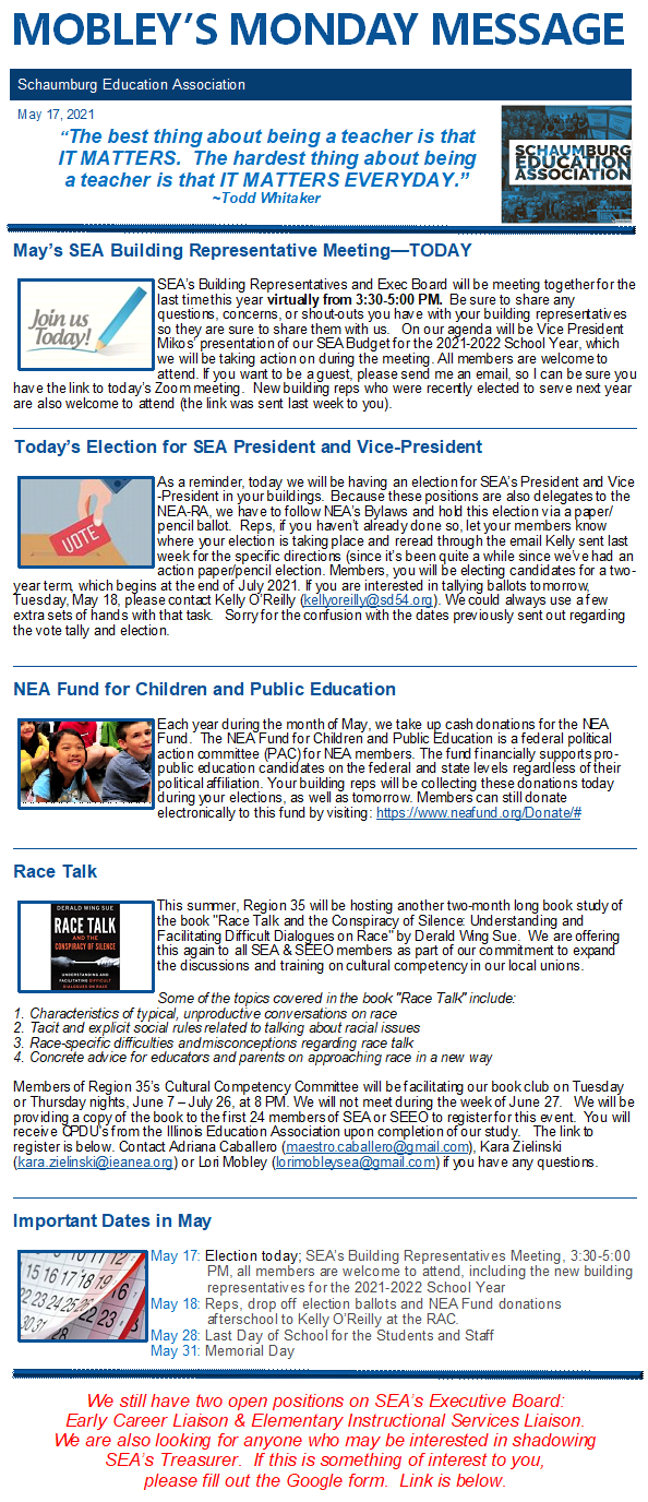 Mobley’s Monday Message 5-17-2021 Ongoing important links: Region 35 “Race Talk” Summer Book Study for SEA & SEEO Envision Equity Grant SEA Exec Board Application Illinois Virtual Instructional Coach and Building Mentor Program NEA Fund Related