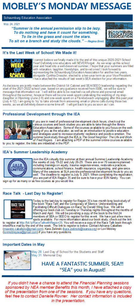 Mobley’s Monday Message 5-24-2021 Ongoing important links: Region 35 “Race Talk” Summer Book Study for SEA & SEEO Envision Equity Grant SEA Exec Board Application Illinois Virtual Instructional Coach and Building Mentor Program NEA FundIEA’s Summer Leadership Academy Related